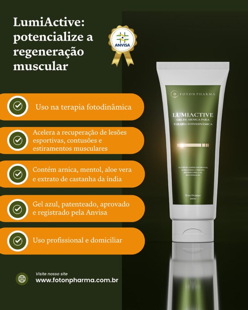LUMIACTIVE, um gel de azul brilhante formulado para acelerar a recuperação de lesões esportivas, contusões e estiramentos musculares. Este produto patenteado é um avanço significativo na terapia fotônica, proporcionando resultados rápidos e eficazes.